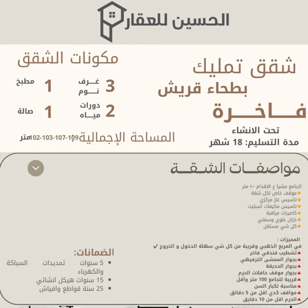 🔸الخدمات العامة كلها مشي ع الاقدام 🔸 الجامع مشيا ع الاقدام 100 متر 🔸موقف خاص لكل شقة 🔸تاسيس غاز مركزي 🔸تاسيس مكيفات اسبليت 🔸كاميرات مراقبة 🔸خزان علوي وسفلي