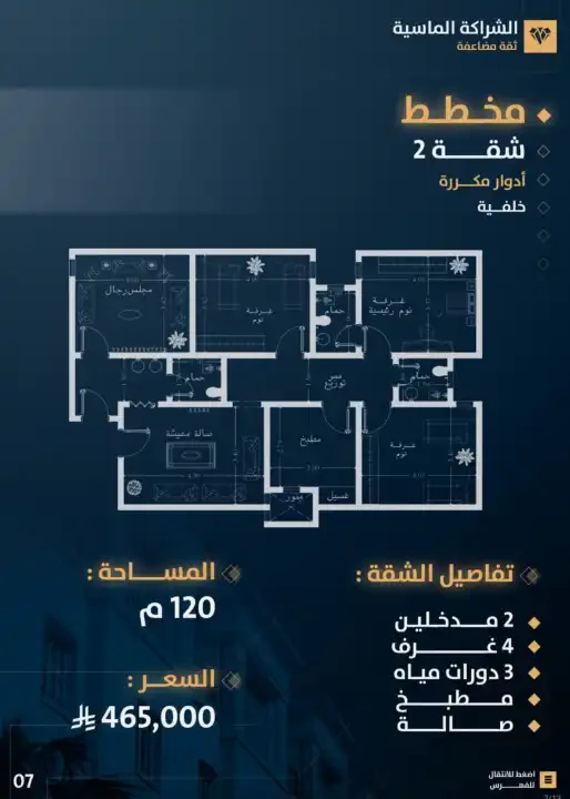 شقة خلفية مكونة من 4 غرف بمساحة اجمالية 120 متر